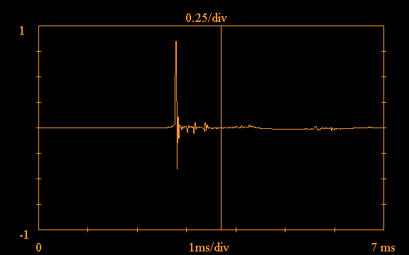 Note the vertical line at approximately 1.8ms in the above plot; the software provides the option of truncating the impulse response, in order to carry out a "quasi-anechoic" measurement. If this option is selected, the software ignores all data to the right of the truncation point, treating it as zero. This option is useful for eliminating the effects of room reflections. Such a reflection is clearly evident in the above plot just after 3.5ms.